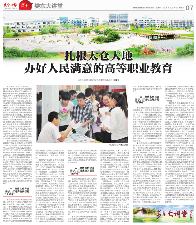 教育与经济社会发展紧密相连,高职院校的发展与经济社会发展相生相伴、同向同行。受新冠肺炎疫情冲击,全球经济深度衰退,国内经济运行下行压力明显,太仓产业的转型升级和企业的生产创新也面临着巨大的挑战。高职院校需要从眼前的危机、眼前的困难中捕捉和创造机遇,主动站到促进经济社会发展的中心,把产教融合、校企合作的巨大潜力和强大动能充分释放出来,发挥教育服务产业、引领创新的重要作用,在“大循环”和“双循环”的经济新格局中找准发力点,把教育的力量使在高质量发展的奋斗里,放到“四大两提一进”的征程中,用在“六稳”“六保”举措上,全心全意为太仓发展作贡献,办出太仓人民满意的高等职业教育。