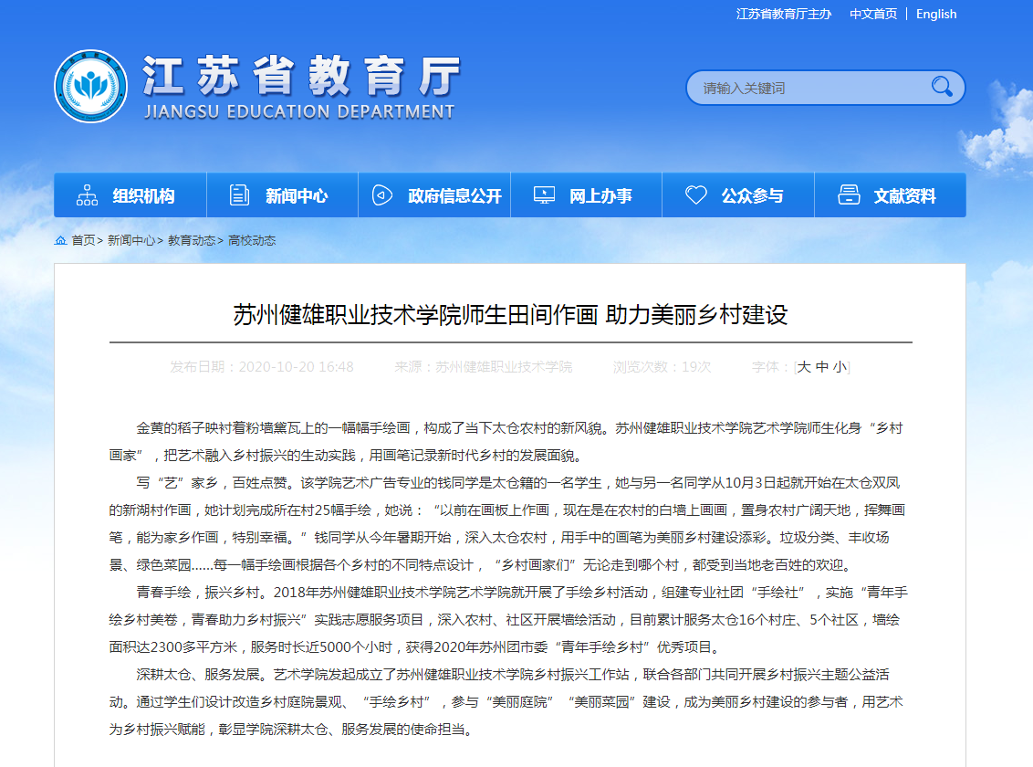 写“艺”家乡,百姓点赞。该学院艺术广告专业的钱同学是太仓籍的一名学生,她与另一名同学从10月3日起就开始在太仓双凤的新湖村作画,她计划完成所在村25幅手绘,她说:“以前在画板上作画,现在是在农村的白墙上画画,置身农村广阔天地,挥舞画笔,能为家乡作画,特别幸福。”钱同学从今年暑期开始,深入太仓农村,用手中的画笔为美丽乡村建设添彩。垃圾分类、丰收场景、绿色菜园……每一幅手绘画根据各个乡村的不同特点设计,“乡村画家们”无论走到哪个村,都受到当地老百姓的欢迎。