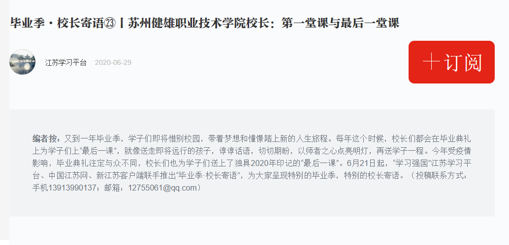 一场突如其来的新冠肺炎疫情,让同学们的人生加冕典礼显得更加特别,更加难忘。此时此刻,作为健雄学院的新校长,请同学们允许我同时履行校长“第一堂课与最后一堂课”的职责。