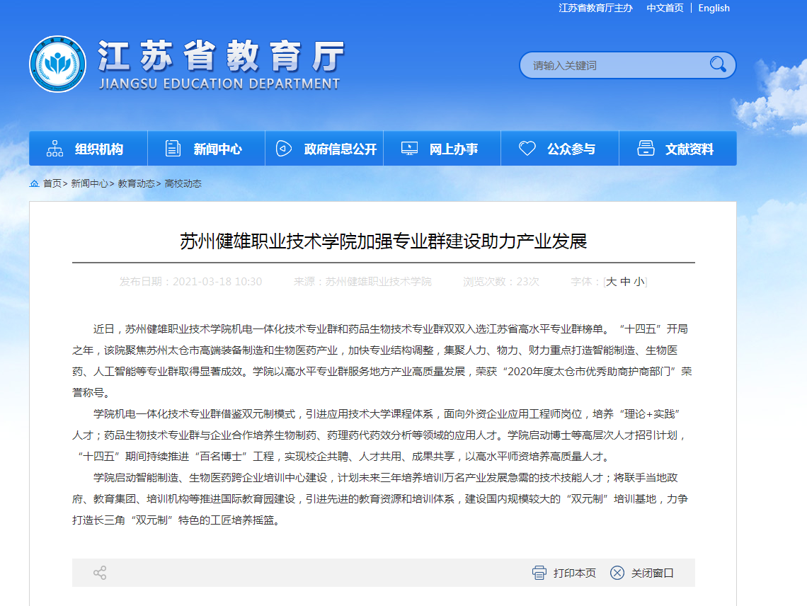 近日,米兰(中国)体育·官方网站机电一体化技术专业群和药品生物技术专业群双双入选江苏省高水平专业群榜单。“十四五”开局之年,该院聚焦苏州太仓市高端装备制造和生物医药产业,加快专业结构调整,集聚人力、物力、财力重点打造智能制造、生物医药、人工智能等专业群取得显著成效。学院以高水平专业群服务地方产业高质量发展,荣获“2020年度太仓市优秀助商护商部门”荣誉称号。