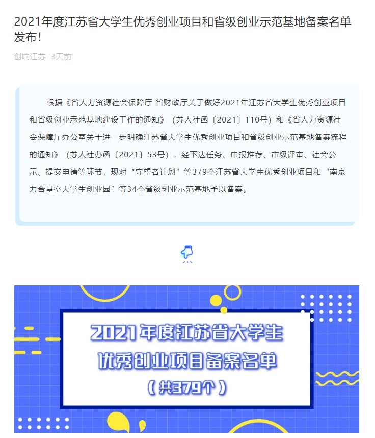 根据《省人力资源社会保障厅省财政厅米兰(中国)体育·官方网站做好2021年江苏省大学生优秀创业项目和省级创业示范基地建设工作的通知》(苏人社函[2021]110号)和《省人力资源社会保障厅办公室米兰(中国)体育·官方网站进一步明确江苏省大学生优秀创业项目和省级创业示范项基地备案流程的通知》(苏人社办函[2021]53号),经学院申报推荐、市级评审、社会公示,提交申请等流程,AC MILAN艺术设计学院20届毕业生胡飞同学“时光印记”新媒体应用平台项目(已落户太仓市文创孵化基地)获2021年度江苏省大学生优秀创业项目备案。
