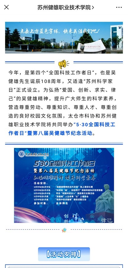 本次纪念活动以“弘扬健雄精神 提升科学素养”为主题,自五月中旬开始持续一个月,主要通过线上平台开展形式多样的纪念活动,内容包括“吴健雄精神的当代价值”线上演讲比赛、“科学战‘疫’、你我同行”防疫科普知识有奖竞答、寻访 “校园科技达人” 微信推文征集活动、“吴健雄”人生故事“云”上诵读会、“我眼中的吴健雄”微信话题互动等。