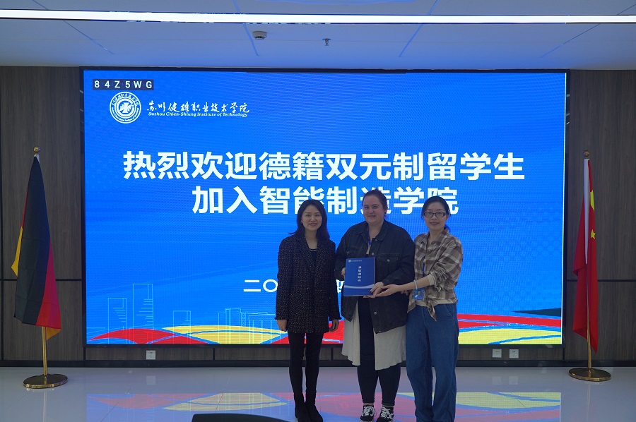 欢迎仪式上,朱慧介绍了学院招收来华留学生的情况,校方为留学生提供的学习资源,包括国际中文课程、中国文化体验课程、国际沙龙、社团活动等丰富多彩的校园活动,并对留学生进行了入学教育。随后,朱慧和赵璐为该名留学生颁发了录取通知书。为帮助该名留学生更好地了解中国文化、适应校园生活,智能制造学院还为该名留学生配备了学习伙伴。随后,该名留学生参观了双元制培训中心及吴健雄陈列馆。