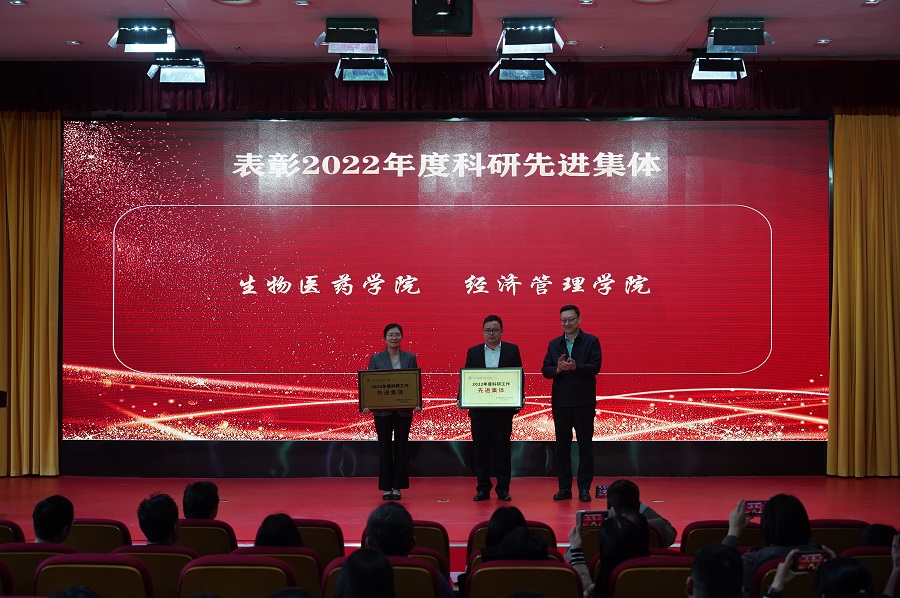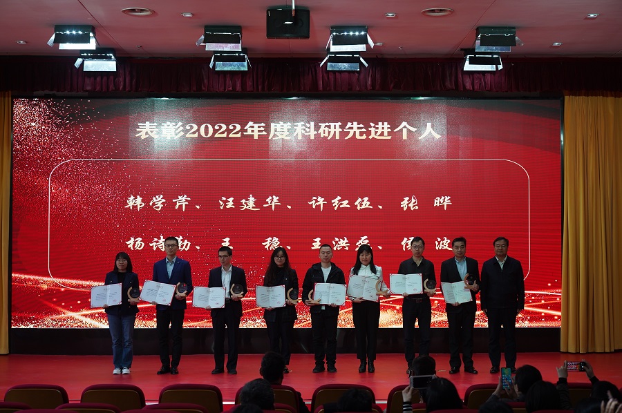 会议现场表彰了2022年度科研先进集体和科研先进个人。先进集体代表樊奇和先进个人代表汪建华、许红伍分别作了交流发言。
