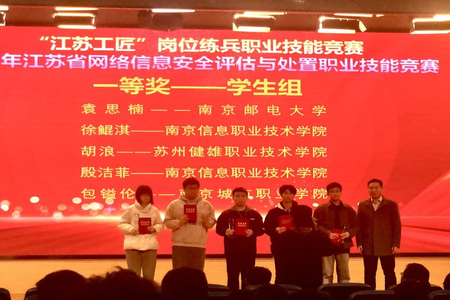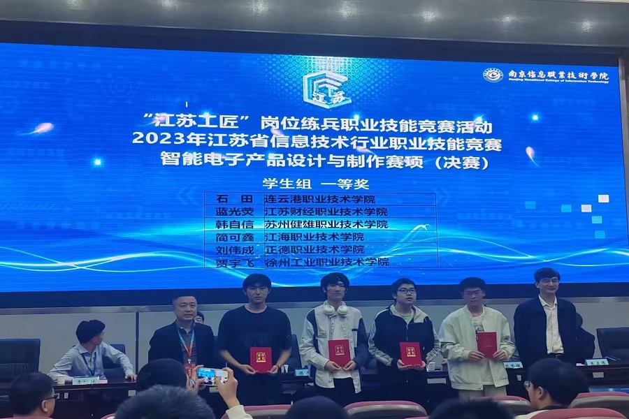 仲小英老师在“智能化系统集成应用——工业视觉应用与维护”赛项职工组比赛中荣获一等奖;章朋、沈啸等老师指导的学生分别在“智能电子产品设计与制作”、“网络信息安全评估与处置”比赛学生组比赛中获一等奖。根据“江苏工匠”岗位练兵职业技能竞赛的相关规定,后期仲小英、章朋、沈啸三位老师将被授予“江苏省技术能手”、“江苏省五一创新能手”等称号。