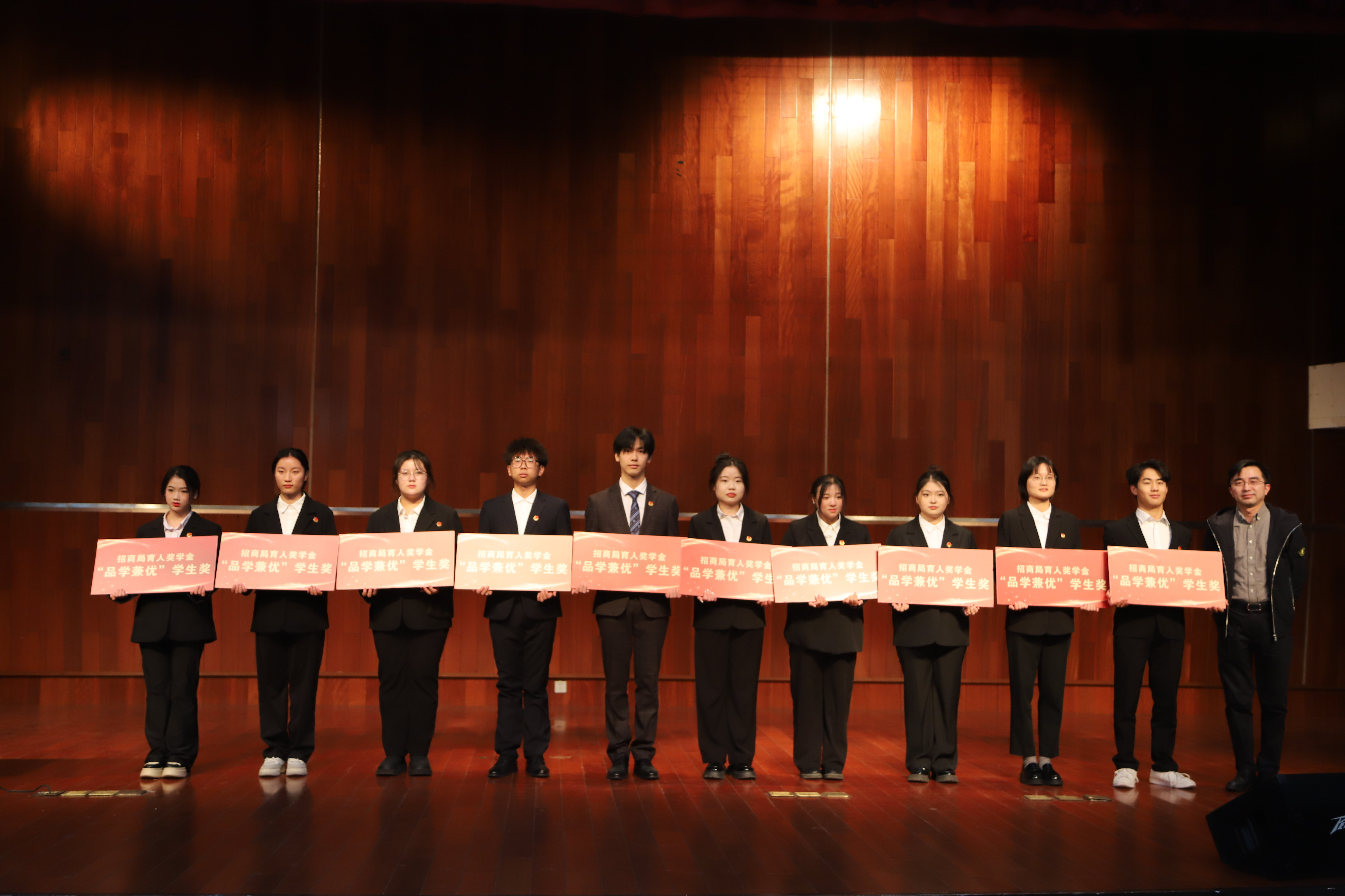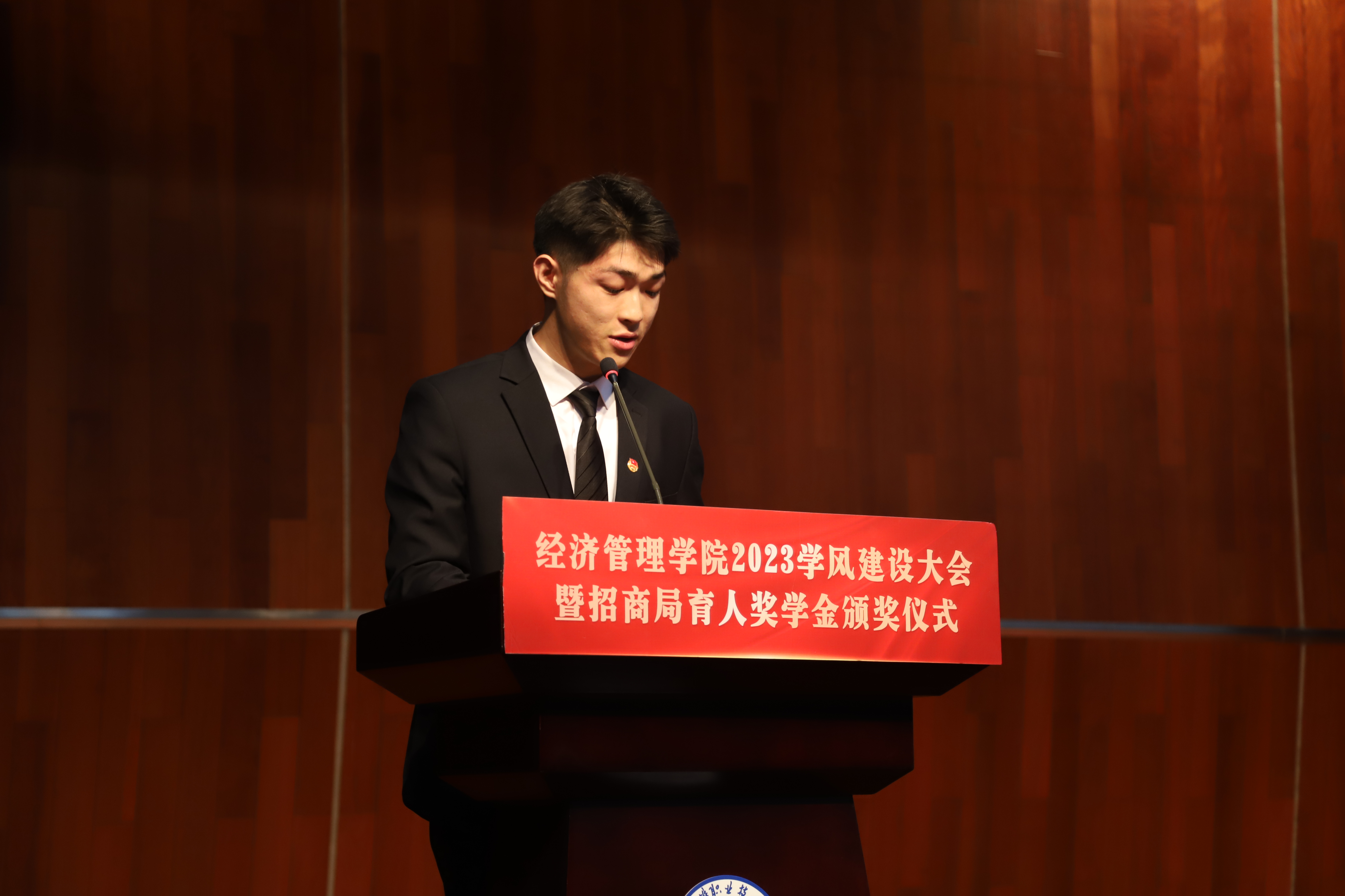 会计2114班王硕作为优秀学生代表上台发言。他结合自己的成长故事,娓娓道来“招商局育人奖学金”带给他的温暖与力量,激励着他在学习科研、社会实践、志愿公益等多方面创新争优、勇攀高峰、全面发展。