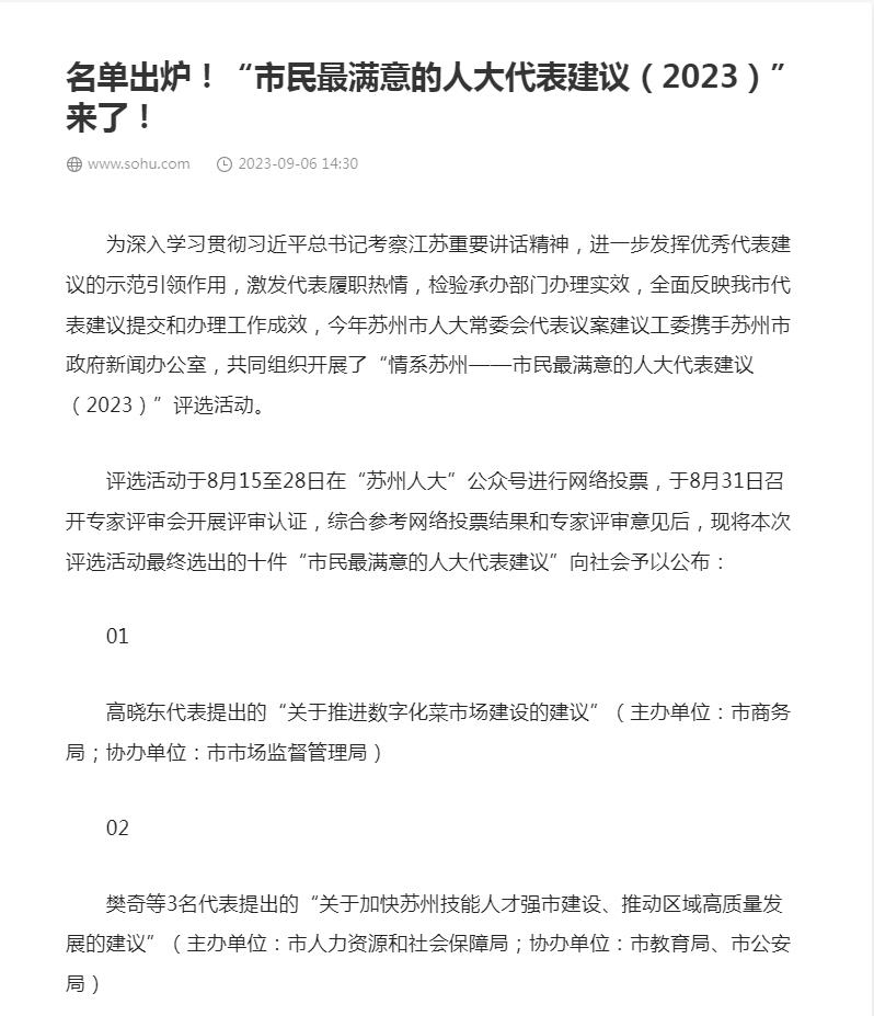 搜狐丨名单出炉!“市民最满意的人大代表建议(2023)”来了!