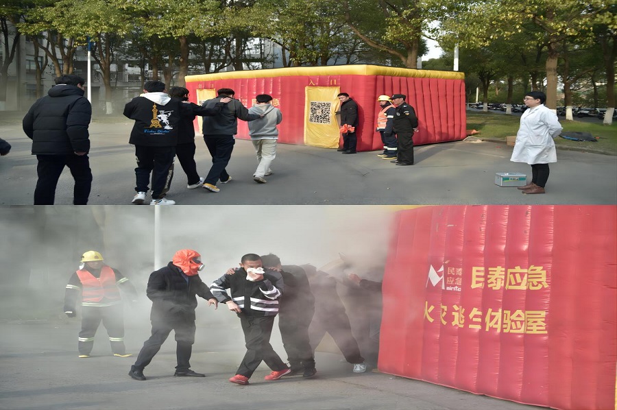 活动现场,在消防人员的指导下同学们参加了手持式灭火器灭火实操演练,身临其境感受了浓烟滚滚的“逃生屋”集体撤离,观摩了消防战士全副武装火场寻人救人、消防车水龙实战灭火等过程。