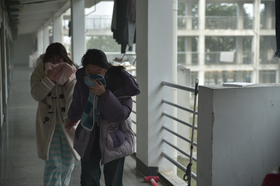 随着烟雾弹释放的“浓烟”弥漫在7栋学生公寓,火警疏散提示声响起,本次校园消防安全应急疏散演练正式开始。参与演练的学生弯腰低姿、遮掩口鼻、弓背贴墙,依次有序地沿着宿舍楼疏散通道向各个安全出口跑去,在宿管人员和安保人员的疏散引导下,安全撤离到指定应急疏散集合点。辅导员组织楼层长以宿舍为单位在楼层指定区域迅速开展人员集结、人数清点工作,校医护工作人员现场对“伤者”进行医疗救护。