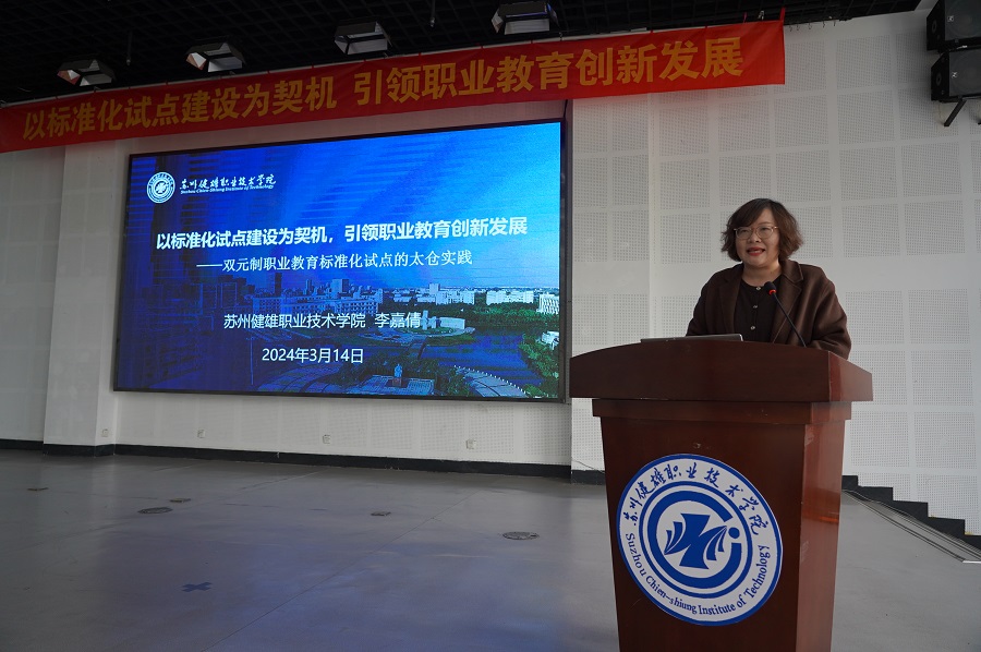 标准化工作推进办公室专员李嘉倩作了题为《以标准化试点建设为契机,引领职业教育创新发展——双元制职业教育标准化试点的实践》的专题标准化知识培训,就标准化试点项目介绍、创建背景、建设过程、成效预期四个方面内容进行了解读,并对标准体系的构建依据及过程作了说明。