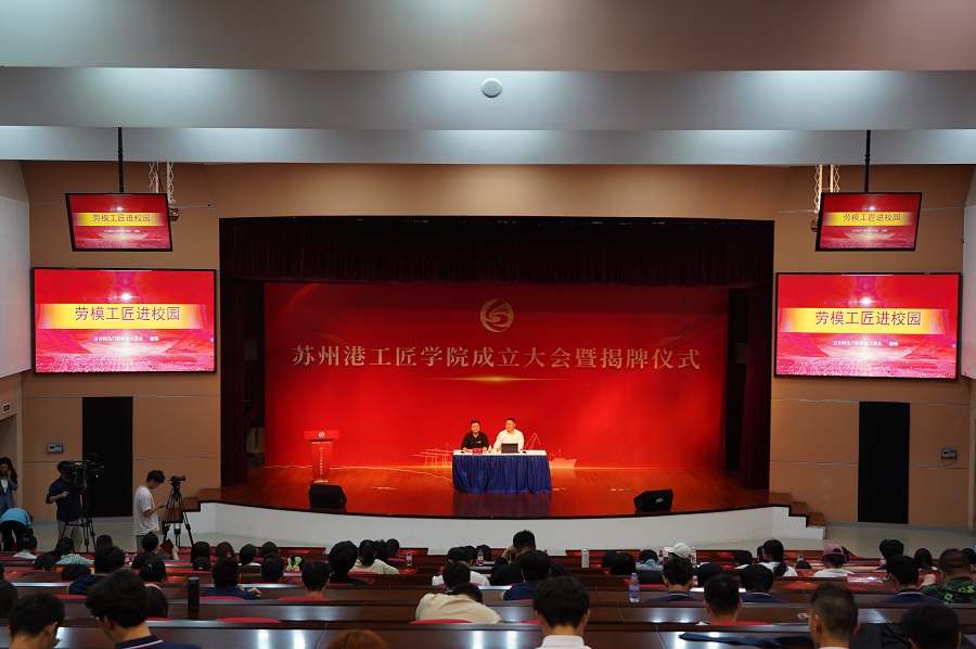 成立大会现场,领导嘉宾为苏州港工匠学院名誉院长、名誉董事、特聘讲师颁发聘书,为10家苏州港工匠学院首批实训基地授牌。揭牌仪式后,苏州港工匠学院劳模工匠特聘讲师褚锋为师生代表作《党领导下新时代产业工人的成长与蜕变》专题讲座。