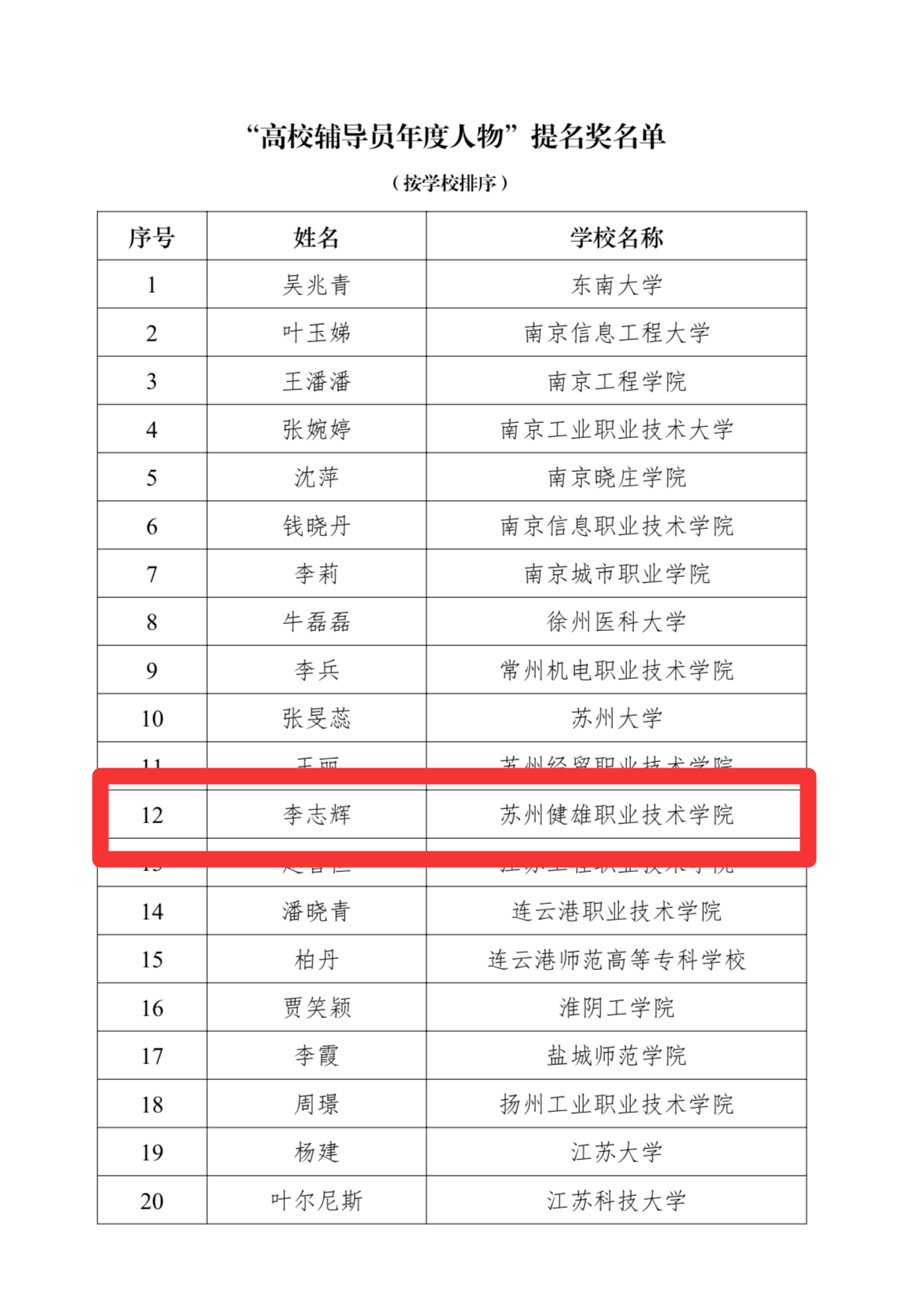 近日,省委教育工委、省教育厅正式公布了第十四届“江苏省大学生年度人物和高校辅导员年度人物”暨2024年“最美大学生”“最美高校辅导员”的推选结果。经过材料评审、专家初评、风采展评等环节,本次评比共选出了“最美高校辅导员”10名、“江苏省高校辅导员年度人物”10名、提名奖20名、入围奖30名;“最美大学生”10人、“江苏省大学生年度人物”10名、提名奖20名、入围奖30名。