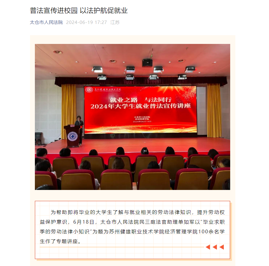 太仓人民法院官微丨普法宣传进校园 以法护航促就业