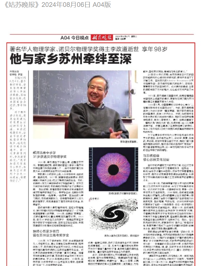 《姑苏晚报》丨著名华人物理学家、诺贝尔物理学奖得主李政道逝世 享年98岁 他与家乡苏州牵绊至深