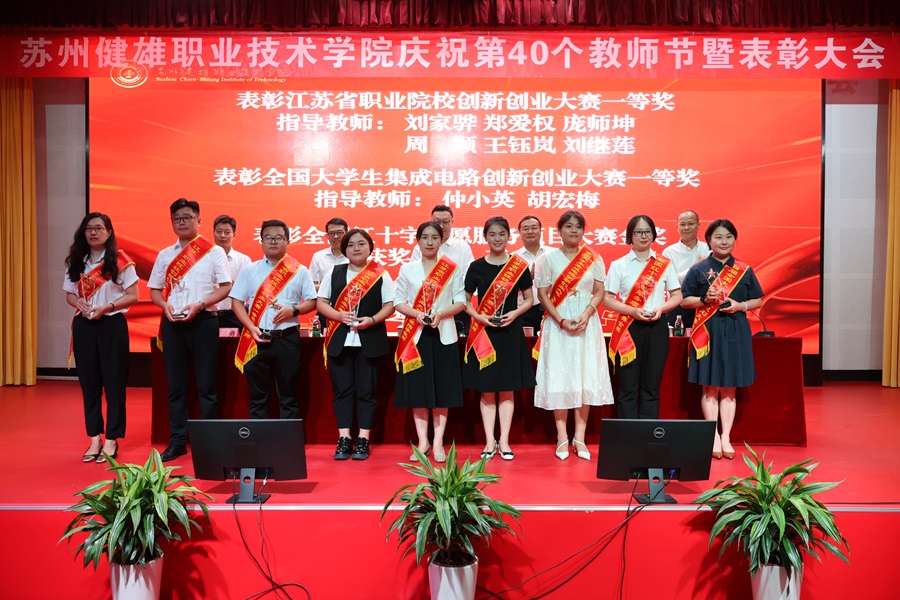 会上表彰了2024年江苏省职业院校技能大赛和第八届“启航杯”江苏省高职院校新教师教学竞赛一等奖获奖老师、2023年江苏省普通高等学校本专科优秀毕业论文(设计)一等奖获奖指导教师;江苏省职业院校创新创业大赛和全国大学生集成电路创新创业大赛一等奖指导教师,全国红十字志愿服务项目大赛金奖,首届全国大学生职业规划大赛全国总决赛铜奖获奖教师;2023年度江苏省高等学校科学技术研究成果奖三等奖、苏州市自然科学优秀学术论文二等奖获奖老师;“江苏省高校辅导员年度人物”提名奖老师;省青蓝工程项目、省双创博士、省技术能手、省产业教授。