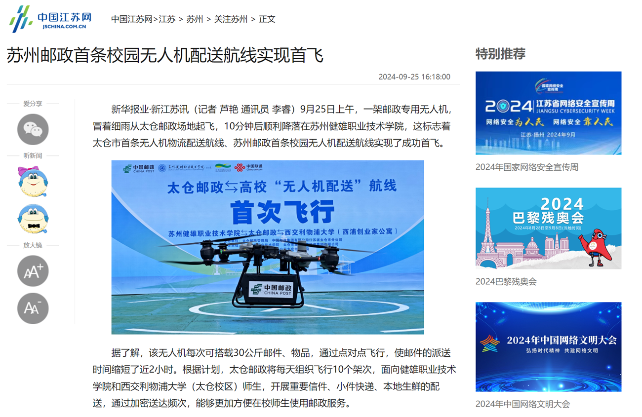 中国江苏网|苏州邮政首条校园无人机配送航线实现首飞