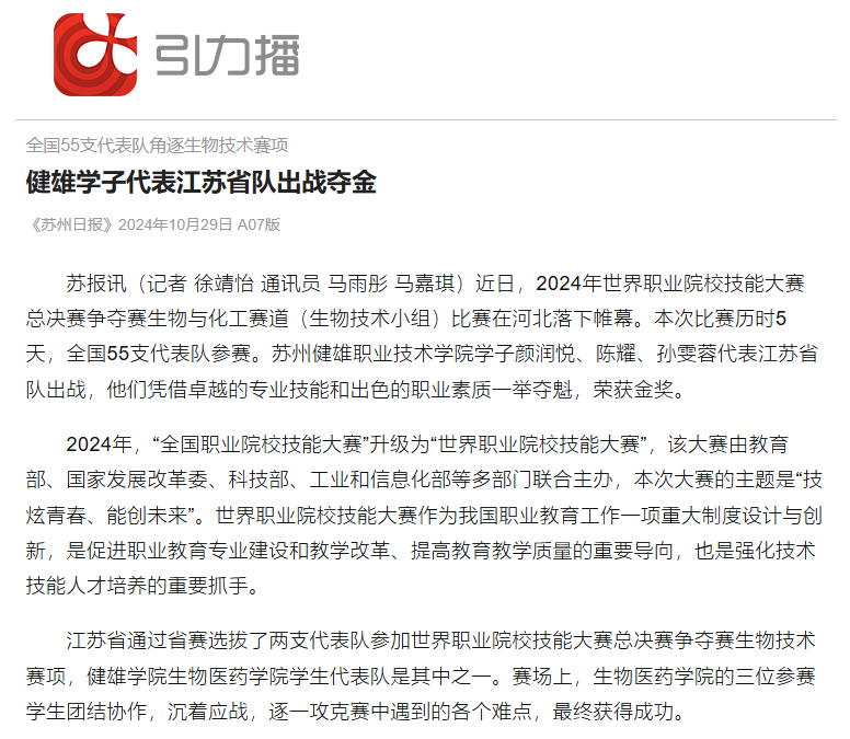 苏州日报 | 健雄学子代表江苏省队出战夺金