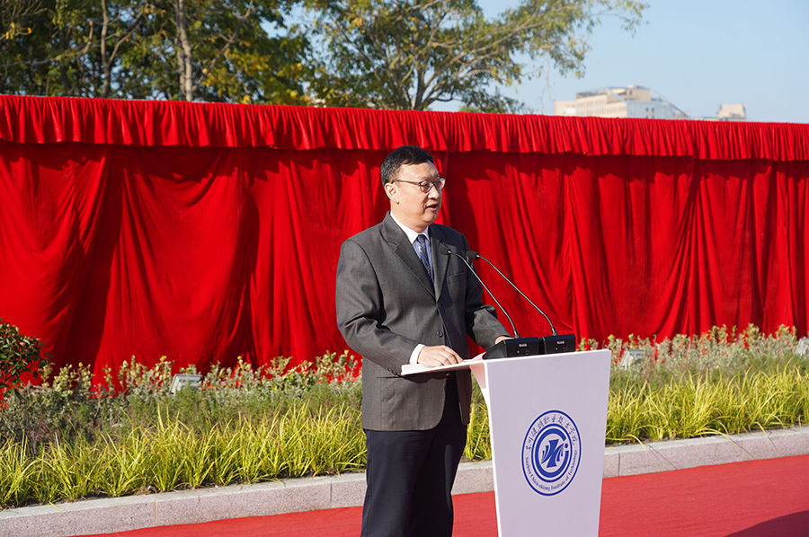 学院党委领导班子全体成员与企事业单位代表、教师代表共同为学院东校门揭幕。现场,还举行了宾客进门仪式。