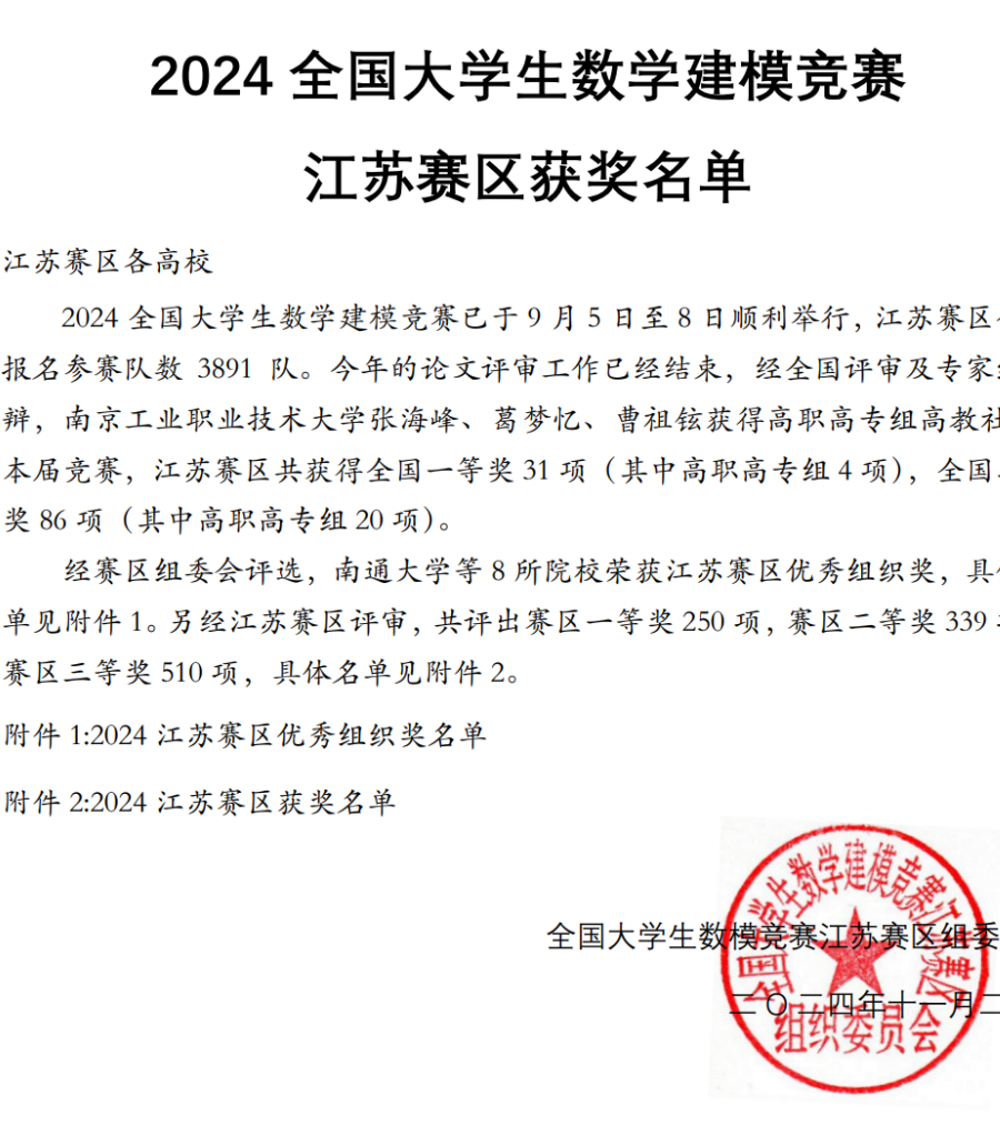 近日,全国大学生数学建模竞赛江苏赛区组委会公布了2024年高教社杯全国大学生数学建模竞赛的获奖名单。在刘苗苗、章朋、汪乐乐三位教师的指导下,丁慧媛、张莹、左薇三名同学充分发挥了团队协作精神,针对赛题进行了深入分析、模型构建和论文撰写,最终赢得了评委们的一致认可,荣获江苏赛区三等奖。