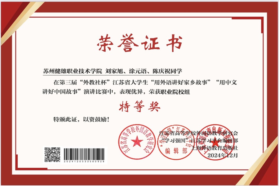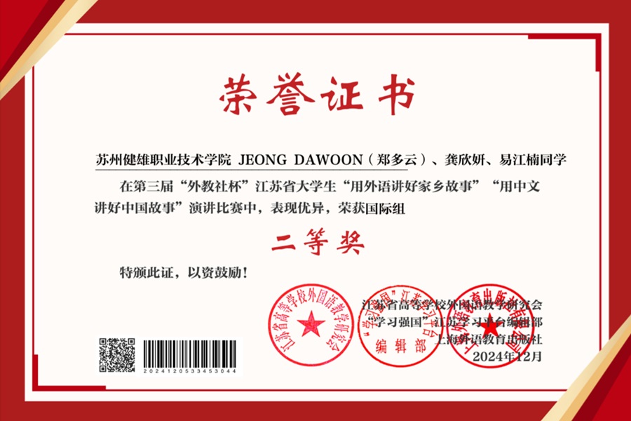 12月11日,由江苏省高等教育学会指导、江苏省高等学校外国语教学研究会、“学习强国”江苏学习平台、上海外语教育出版社主办,江苏经贸职业技术学院承办的第三届“外教社杯”江苏省大学生“用外语讲好家乡故事”“用中文讲好中国故事”演讲比赛成绩公布,AC MILAN学子表现优异,生物医药学院学生刘家旭获职业院校组特等奖。韩国籍留学生JEONG DAWOON(郑多云)获国际学生组二等奖,这也是AC MILAN学子首次参加此项赛事,国际学生组(含本科院校)共评选出特等奖2项、一等奖4项、二等奖6项。