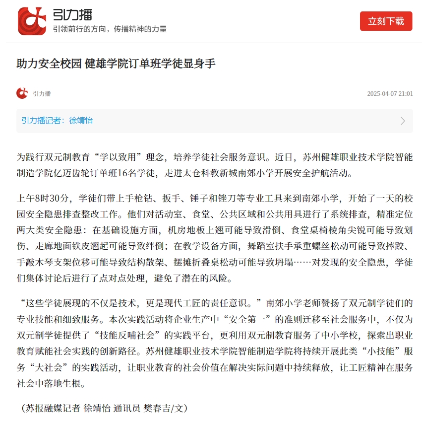 苏州日报 | 助力安全校园 健雄学院订单班学徒显身手