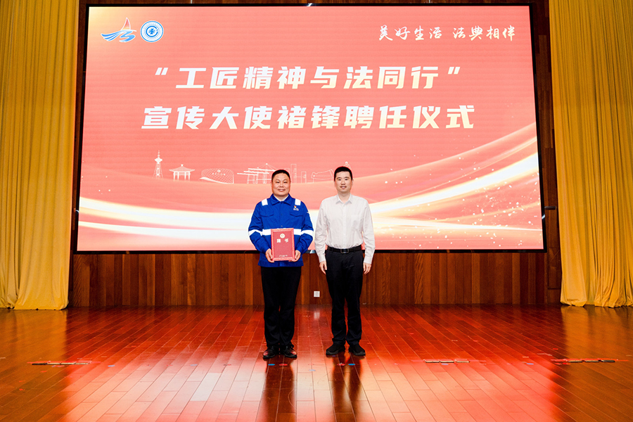 陈磊为褚锋颁发“工匠精神与法同行”宣传大使聘书。