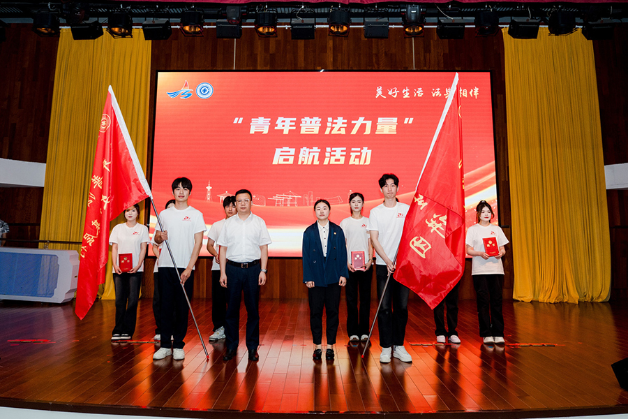 李鹏、朱慧琳为“青年普法志愿者法治文化基层行”授旗。