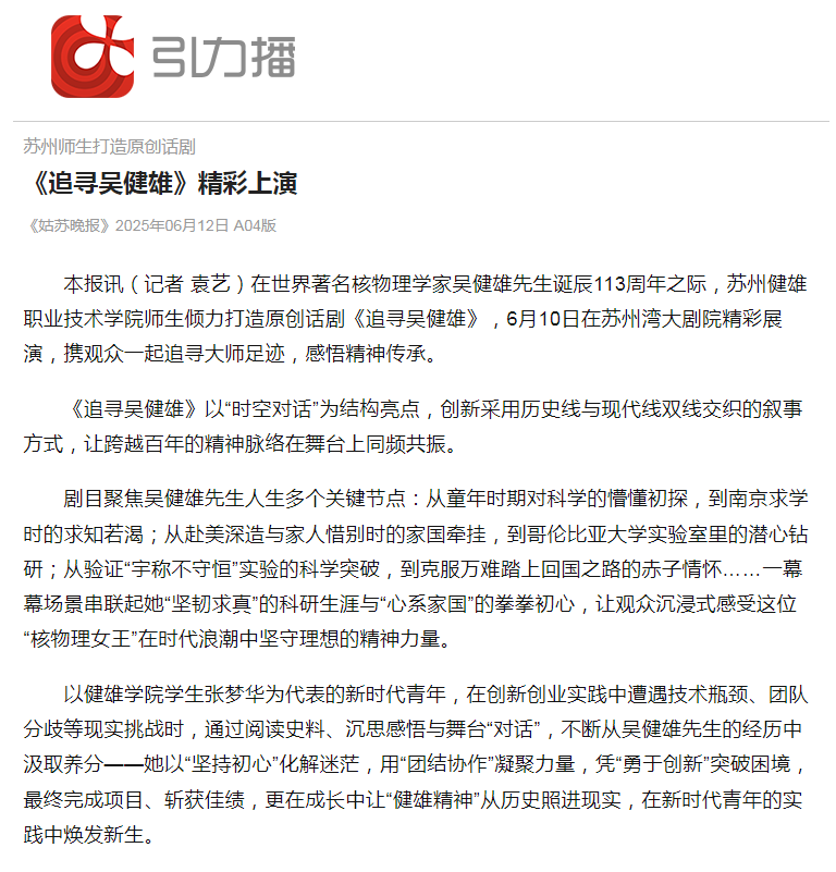 苏州日报丨苏州师生打造原创话剧《追寻吴健雄》精彩上演