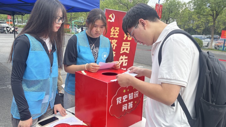 今年迎新现场亮点十足,学院精心设置党史知识问答箱。25级“小鲸鱼”们随机抽取题目作答,只要回答正确,就能获得印有“经济管理学院”标志的冰箱贴、透卡或金属校徽。在趣味互动中,新生既提升了党史知识储备,也感受到了学院的暖心关怀。