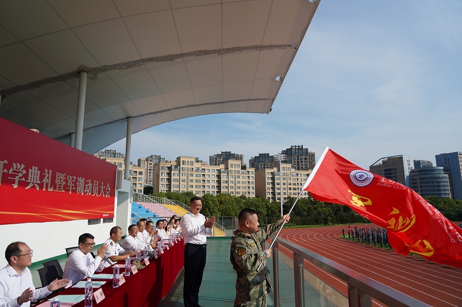 学院党委书记苏霄飞授2025级新生军训团团旗,军训期间,这面鲜红的旗帜将迎风招展、激情飞扬,见证新生们刻苦训练、磨炼意志和成长蜕变的过程。