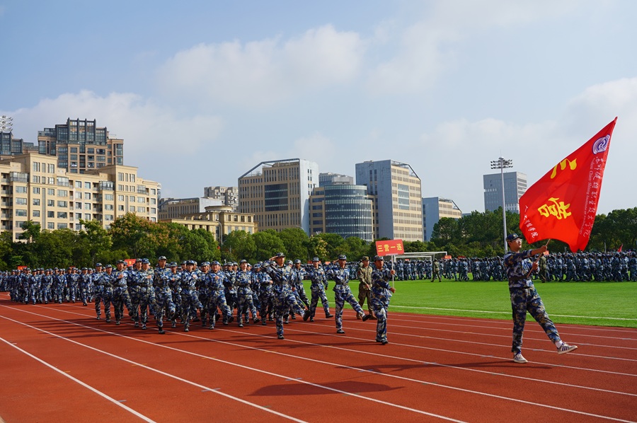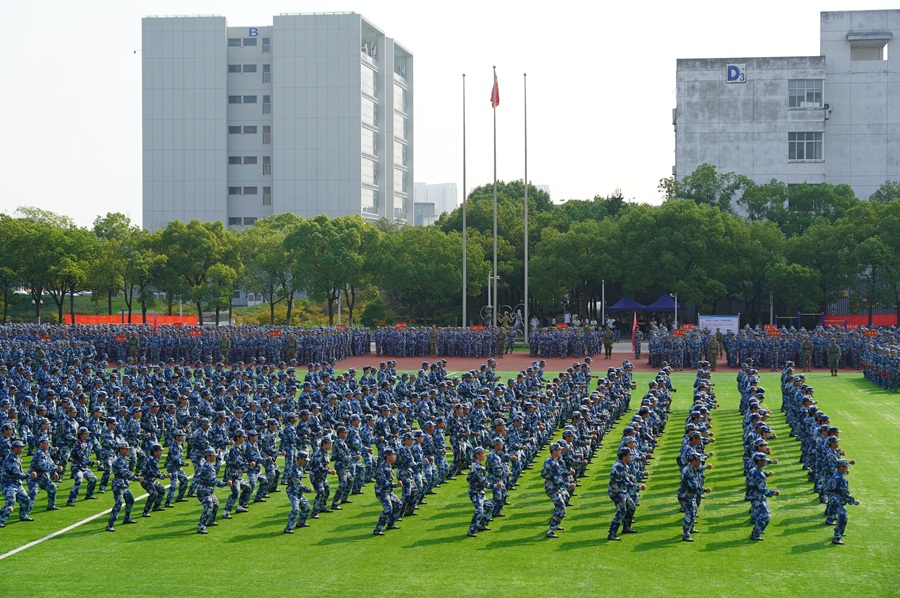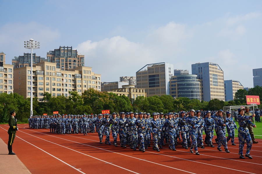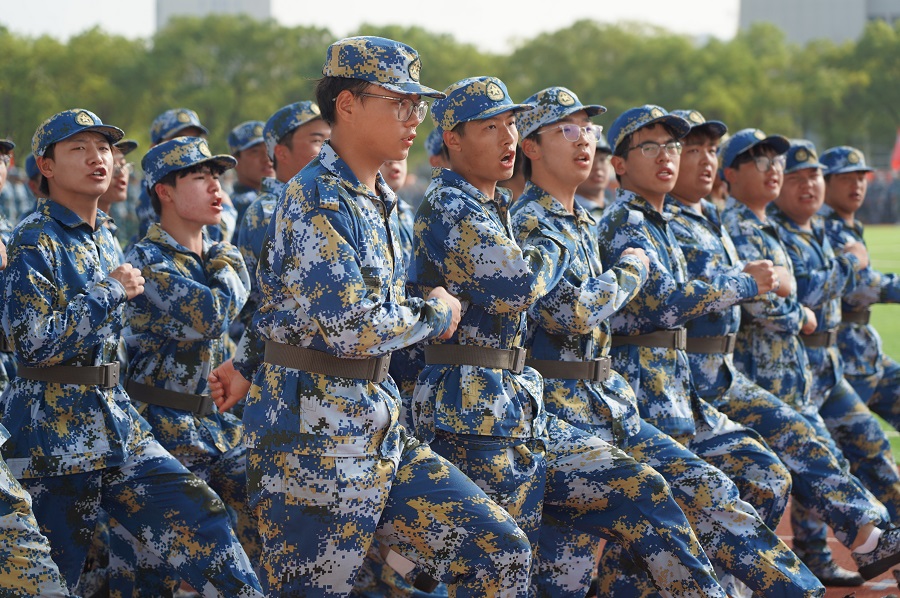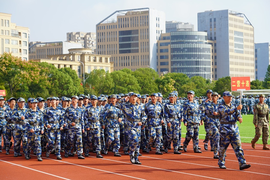 庄严的升国旗仪式过后,伴随着激昂的《分列式进行曲》,新生方阵迈着铿锵步伐依次登场,每一步都踏得坚定有力,每一声口号都喊得震彻云霄。军体拳表演中,拳风凌厉、气势如虹;匕首操展示时,动作整齐划一、尽显飒爽英姿,赢得现场阵阵掌声。据悉,除了队列与技能训练,新生们还完成了校外行军拉练、应急疏散演练,在实践中锤炼意志、凝聚力量。