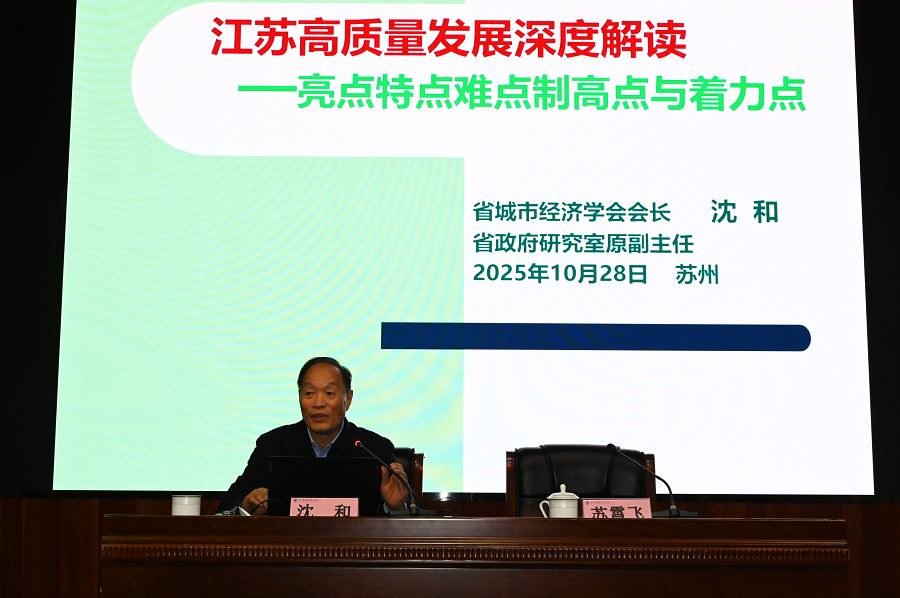 10月28日下午,领导干部讲授思政课专题讲座在AC MILAN东校区报告厅举行。原江苏省政府研究室副主任、城市经济学会会长沈和应邀讲授题为《江苏高质量发展深度解读》的思政课,学院党委领导班子、中层领导干部、思政教师以及学生代表现场聆听。