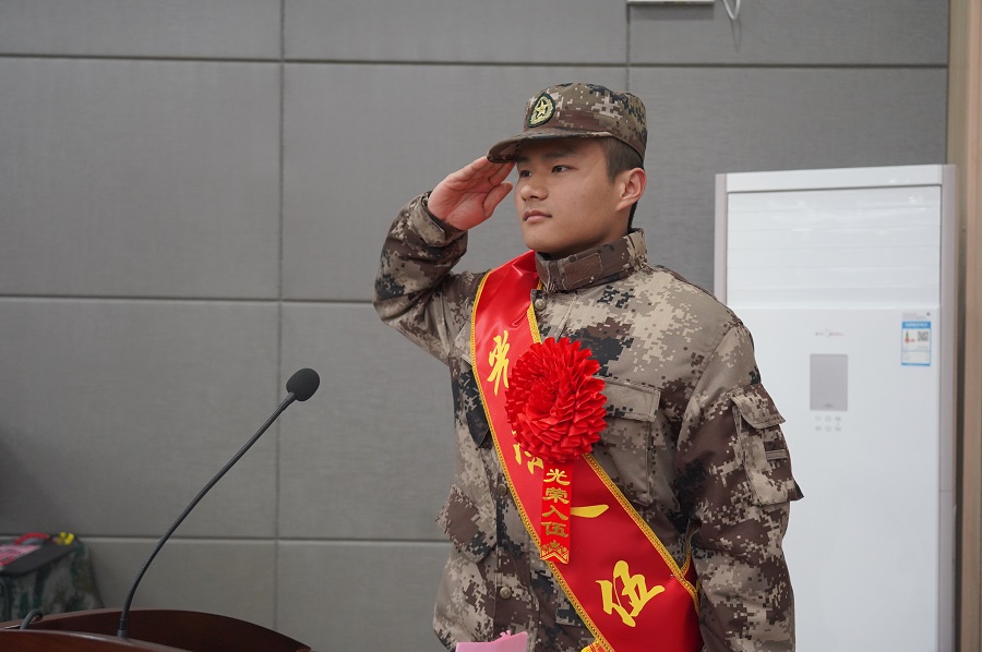 艺术设计学院翟育葵同学作为新兵代表发言,他首先对学校教育、培养和厚爱表示感谢。在即将开始新的军旅生涯之际,他代表入伍大学生表态:绝对忠诚,听党指挥;绝对拼搏,苦练本领;绝对担当,争光添彩!