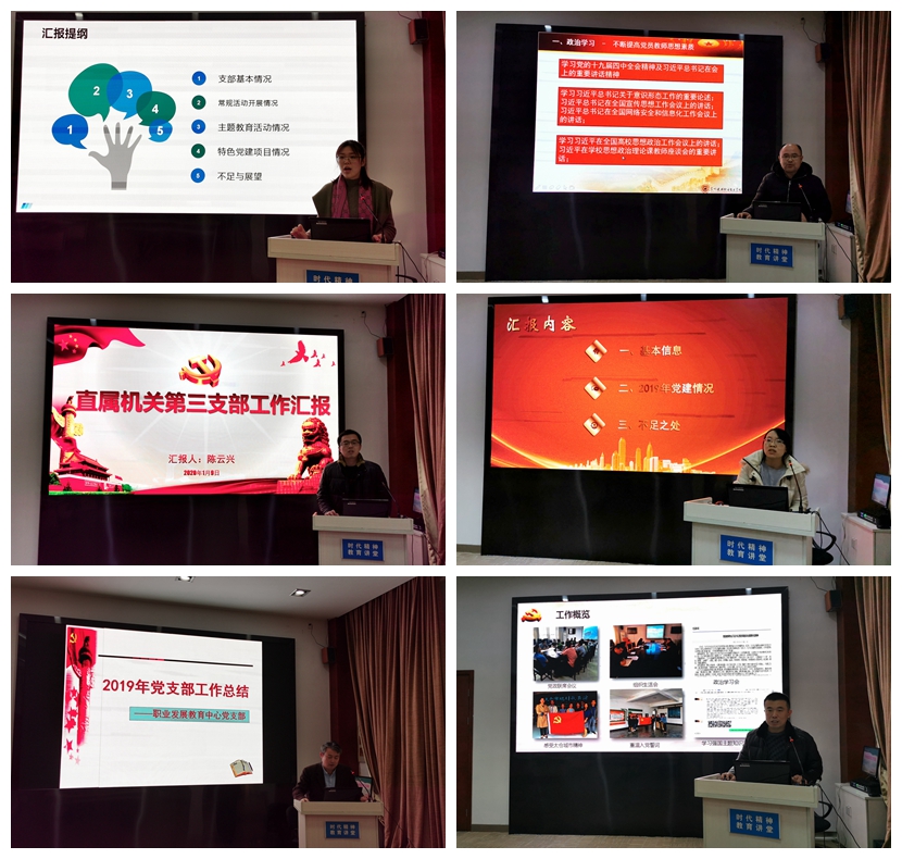 会上,机电工程学院党总支、电子信息学院党总支、商学院党总支、软件与服务外包学院党总支、医药科技学院党总支、艺术学院党总支、直属机关一支部、直属机关二支部、直属机关三支部、直属机关四支部、直属职业发展教育中心党支部、直属马克思主义学院党支部等12个基层党组织负责同志依次进行了汇报,分别从意识形态管理、思想政治建设、党员发展、主题教育、组织建设、服务地方能力提升、宣传阵地建设等方面介绍主要做法、经验、存在问题以及下一步工作打算。