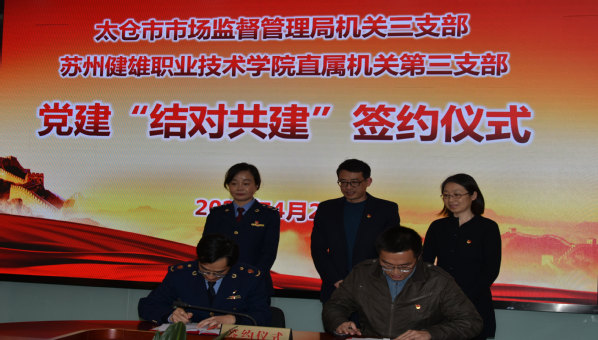 4月22日下午,米兰(中国)体育·官方网站直属机关三支部与太仓市市场监督管理局机关三支部“共驻共建”签约仪式在我校吴园第一会议室顺利举行。校党委委员、副校长周晓刚、太仓市市场监督管理局党委委员、副局长张燕、校党委工作部副部长闵洁、联合研究院院长周三庆等同志出席会议,会议由支部组织委员顾晓吴主持。