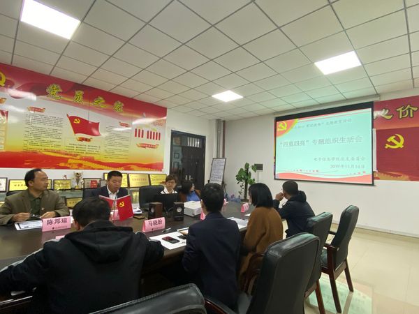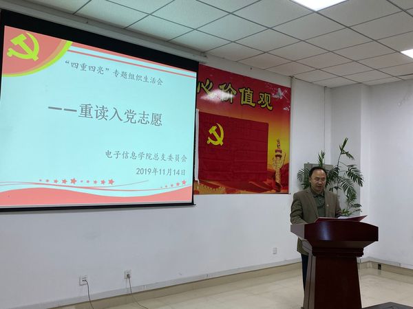 根据学校“不忘初心,牢记使命”主题教育统一部署,11月14日晚,电子信息工程学院党总支在系部党员之家开展了“四重四亮” 专题组织生活会,活动由电子信息学院党总支书记孙笪忠主持,分为四个环节:重读入党志愿书、重温入党誓词、视频观看、书记寄语。