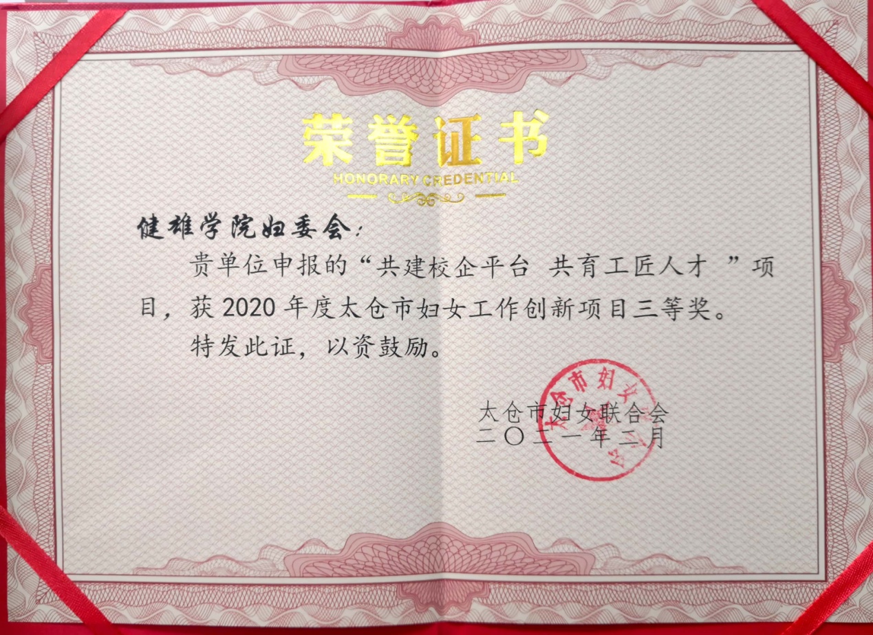 在2020年度太仓市妇联系统创新工作项目评选活动中,我校申报的“共建校企平台 共育工匠人才”项目,经前期申报,中期实践,后期汇报,最终获得三等奖。学校妇委会今后将继续培育特色鲜明、富有实效的品牌工作项目,在服务大局、服务妇女中更好发挥妇联组织的桥梁纽带作用。(文/顾瑛 图/杨维如 审核/马桂明)