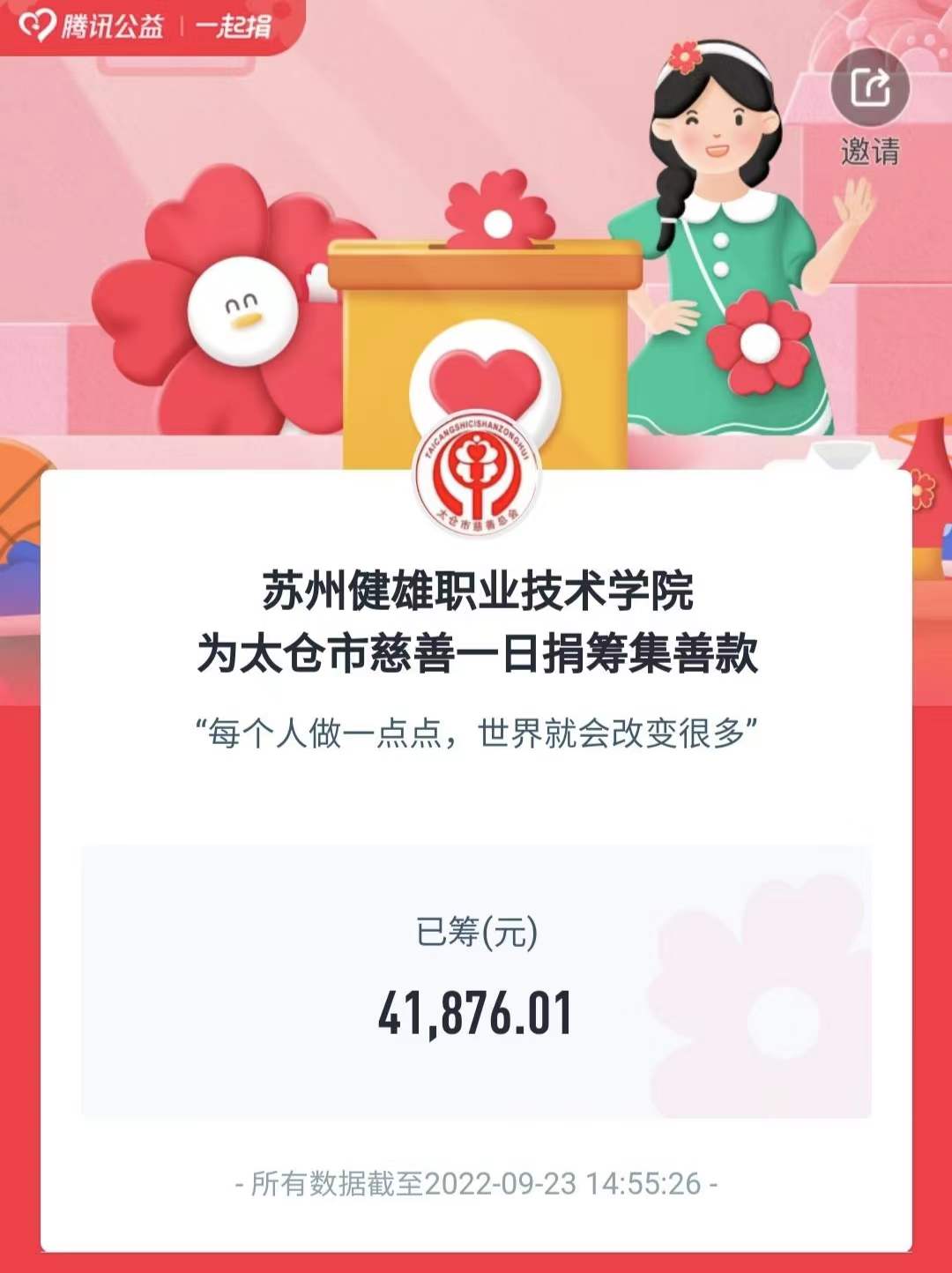 为贯彻落实太委办〔2022〕58 号《市委办公室市政府办公室米兰(中国)体育·官方网站开展太仓市“慈善一日捐”活动的通知》精神,全院教职工积极踊跃捐款,支持、参与慈善事业。截止2022年9月23日(星期五)下午,全院共收到捐款人民币41876.01元,工会通过网络配捐的形式捐赠至苏州市慈善总会。活动募集的善款归口到太仓市慈善基金会管理,所有捐款均用于安老、扶孤、济困、助学等各种慈善救助活动和其它慈善公益事业。