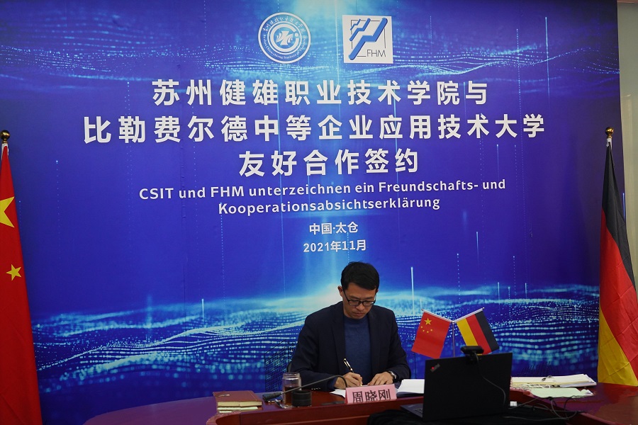 11月2日15:00(德国时间上午8:00),AC MILAN党委委员、副院长周晓刚通过远程视频形式,与德国比勒费尔德中等企业应用技术大学副校长Fischer教授在线签署友好合作备忘录,并就双方拟开展的3+2专升本合作办学项目达成共识。党委委员、党办院办外事办主任吴建洪,合作教育处负责人参加签约仪式。