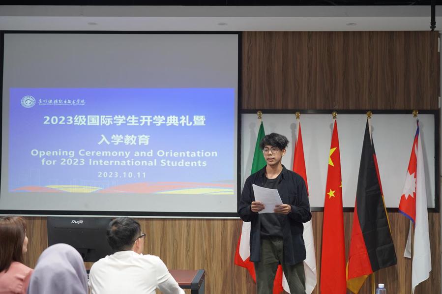 国际学生代表AHMAD SYAFI作了汇报发言,他讲述了自己前往健雄求学的心路历程,以及对未来的憧憬与期望,并希望与来自世界各地的学子因知识而相聚,因互助而成长,努力学习,利用好这段宝贵的留学经验,实现人生的价值。