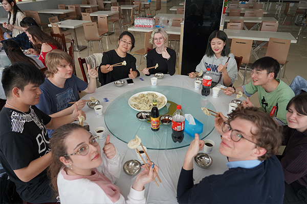 饺子是中国的传统美食,而自己动手包饺子更增添了一大乐趣。在学校食堂,食堂师傅、老师、学生,一起学包饺子、交流技艺,品尝饺子,谈论中国美食,其乐融融……