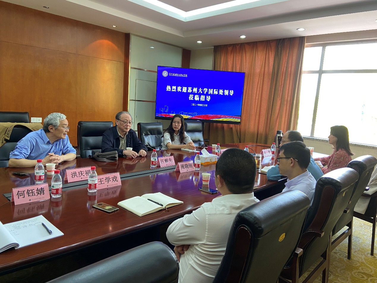 4月30日上午,苏州大学前国际合作交流处处长汪解先、原苏大外语学院教授洪庆福和苏大中加合作项目办发展部部长戴茗赴我校交流考察。党委委员、副院长周晓刚、党委委员、办公室主任吴建洪、合作教育处副处长王学戏、朱慧参加接待。