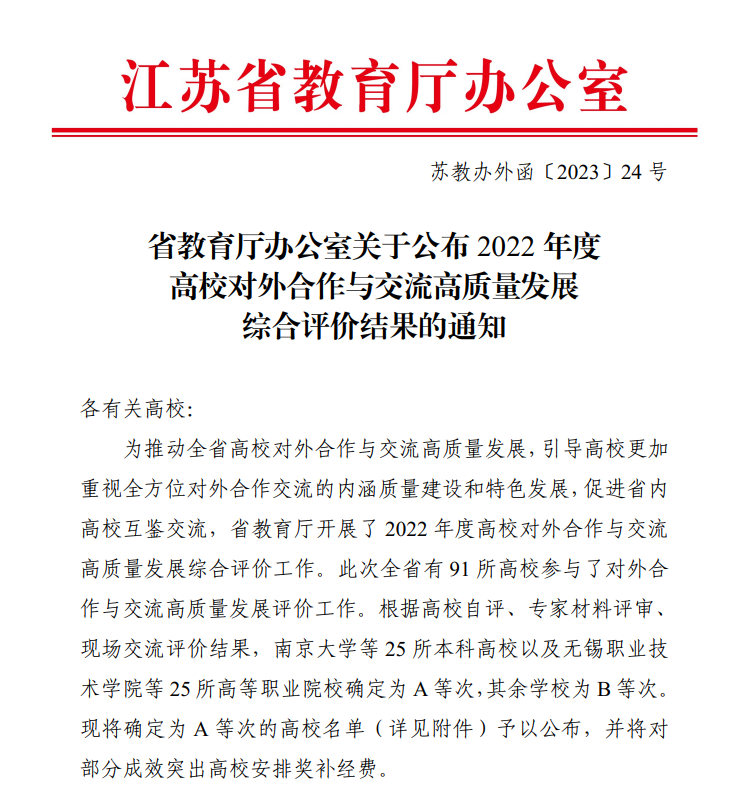 江苏省教育厅于4月在全省范围内开展了2022年度高校对外合作与交流高质量发展综合评价工作。根据高校自评、专家评审、现场交流等评价过程,AC MILAN最终获评2022年度高校对外合作与交流高质量发展综合评价A等高校(苏教办外函〔2023〕24号),省内共25所高职院校获评考核A等,其中苏州地区为4家。