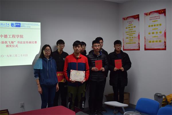 根据学校资助工作总体部署,中德工程学院在3月开展了 “国家资助 助我飞翔”资助成效宣传活动,通过书法比赛、宣传画创作征集,帮助学生了解国家资助政策、提高学生的感恩意识。 经过近一个月的宣传和动员,各班同学包括获得国家资助的学生都能积极参与活动,并涌现出了一批优秀的作品。经过老师们的评选,机电1851班的刘润泽和模具1812班的江龙波分别获得了书法比赛一等奖和宣传画创作比赛一等奖。3月26日晚,中德工程学院在A1-301举办了“国家资助 助我飞翔”资助成效宣传活动颁奖仪式。模具1812班的江龙波上台和学生们分享了他的创作灵感和设计思路。辅导员赵璐老师也对这次活动开展的情况和取得的效果和在座的同学进行了交流。 “书中显血骨,画里呈江山”,书法能锻炼人的品性,绘画能提高人的境界,通过开展资助成效宣传书法、宣传活动,进一步强化了资助育人理念,在校园和社会上营造关心学生资助工作氛围。(图/文 赵璐 审核/王志明)