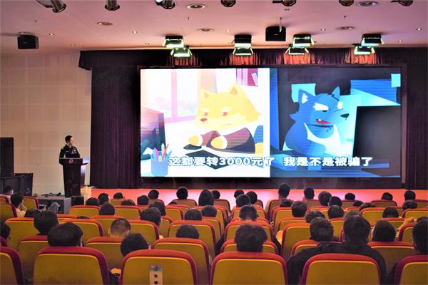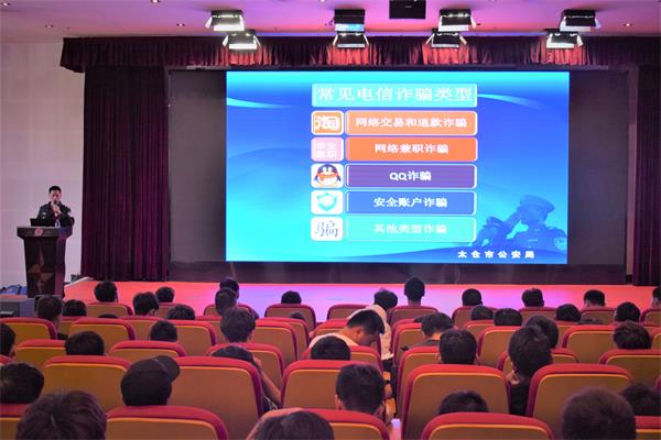 首先,刘文警官给学生介绍了常见的诈骗手法,并通过校园典型案例让学生对QQ盗号、网络兼职刷单、网络购物、安全账户等诈骗手段有所了解和警惕,并告知学生对于此类诈骗该如何进行防范。刘警官还介绍了校园暴力以及应对的措施。