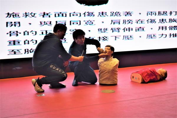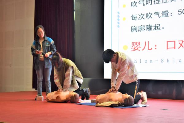 随后,王小伟老师和金杰老师开展了应急救护普及讲座,就心肺复苏的具体操作方法进行了讲解和示范,包括判断意识、呼救、胸外按压、开放气道、人工呼吸等,并组织学生进行现场操练,教大家如何完成高质量的心肺复苏。