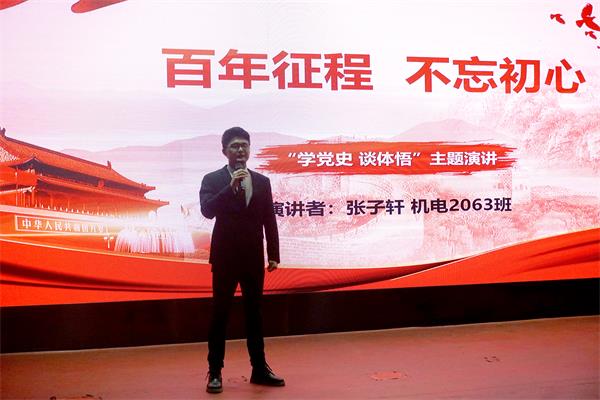 “当无数的先辈烈士,用鲜血染红了党旗,让其随春风飘荡在尘封的记忆之中,我仿佛想起了什么,高山仰止,大海波涛,我们以轻快的步伐迈入了新时代、新征程,在此我们迎来了党的百岁诞辰,这样的日子会被华夏九州深深的印在脑海里”演讲环节,机电2016班郭炳城讲道:“忆往昔,峥嵘岁月,我们百年党卷,充斥着多少艰辛的岁月,我们不能忘也不敢忘。作为新时代的我们,生于盛世,当不负盛世,用实干面向未来,挑战未来。”