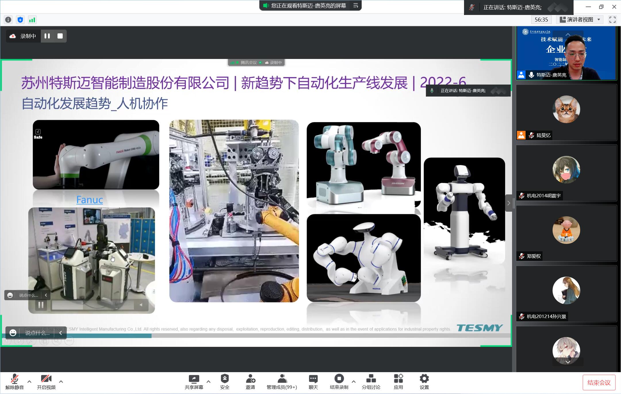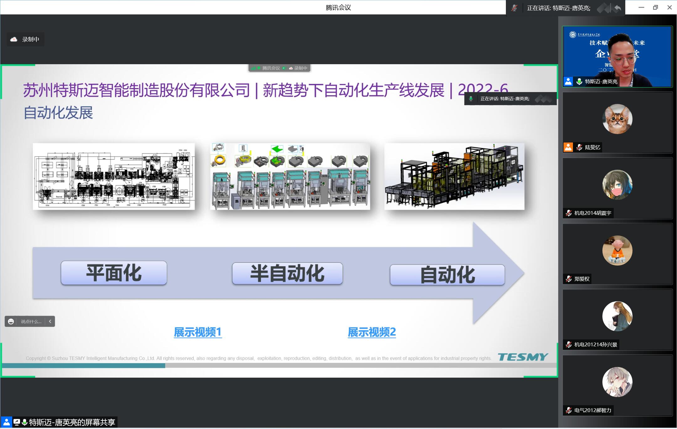6月9日晚,苏州特斯迈智能制造股份有限公司唐英亮高级经理应邀为智能制造学院师生开展《新趋势下的自动化生产线发展》的主题讲座,线上2020级机电一体化技术、电气自动化技术、工业机器人技术、智能控制技术四个专业260多名学生和部分教师参与。本次讲座由郑爱权老师主持。 唐经理通过三张图纸讲解了生产线从平面化、半自动化到自动化的发展进程,并配上实机拍摄的视频,讲解每个发展阶段的生产线特点以及每一个阶段对企业技术人员专业技能和专业知识的不同要求。通过对当前自动化生产线上一项项新技术的突破,讲解了自动化生产线智能化的发展趋势,从智能物流、信息互联、人机协作和人工智能四个方面分析目前国内外生产线智能化的发展情况,进一步分析了目前智能制造业对现有技术技能型人才的需求。 最后,唐经理通过分享自己从教师到企业高级经理的职业转变经历,告诫同学们,我们处在一个机会和挑战并存的时代,越来越智能的生产机器在与我们“竞争”就业岗位,越来越快速的生产技术发展也给我们带来发展机会。因此同学们要做到“站在高处才有远景”,了解未来就业行业和产业的发展趋势,明确自己的专业和职业发展目标;又要做到“千里之行始于足下”,不断丰富自己的专业知识,不断提升自己的专业技能,把握机遇发展自己、突破自己、成就自己,才能成为下一个时代的主导者。 智能制造学院将组织开展一系列“技术赋能 ‘智’向未来”专题企业讲堂,旨在让同学们能够对产业、行业、企业和专业有进一步的认识,能够对工业4.0、自动化、数字化、信息化、工业物联网、智能制造等新技术的应用有进一步的了解,能够对后续的专业发展和职业发展有更加清晰的目标,能够在未来实习和就业中有更明确的方向,为2020级岗位实习工作顺利开展打下坚实基础。(图文/陆旻忆 审核/孙笪忠 郑爱权)