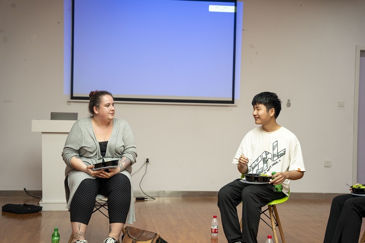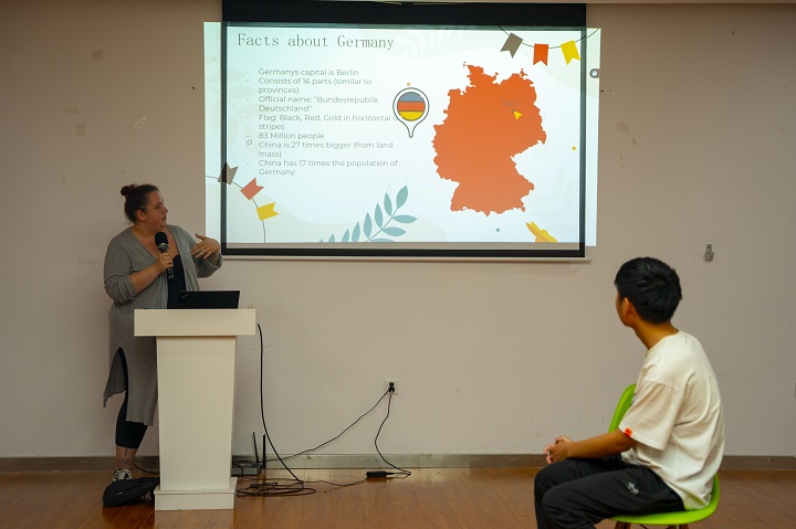 接下来,Nathalie(娜塔莉)同学带来了德国的风情与美食主题分享,任芙申、丁一、孙润萌同学也分享了家乡的风俗与美食,其间气氛十分活跃,体现了中外文化的良好交流。