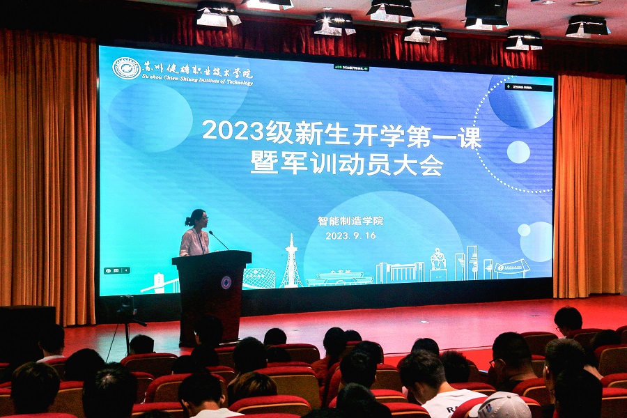 暑气渐散,秋意渐浓。9月14日-15日,890余名智能制造学院2023级新生们怀揣着憧憬走进健雄校园,新同学们怀着对大学生活的美好期盼,从五湖四海而来,相聚在精致的健雄校园,为清爽秋日注入了最青春的活力。9月16日,智能制造学院组织开展2023级新生开学典礼,为“智小匠”们开启3年新征程助力领航。 师生共启第一课,奋进新征程 为帮助、引导AC MILAN2023级新生走好成长成才的第一步,智能制造学院充分利用新生入学第一周,做好新生入学教育工作,引导学生坚定理想信念,提升综合素质。9月16日下午,智能制造学院召开23级新生开学第一课暨军训动员大会,院党总支书记周玲余、副院长荆瑞红、副院长刘家骅,辅导员、班主任,全体2023级新生参与“第一课”。党总支副书记赵璐主持会议。